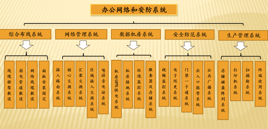 办公系统、存储及安全、数据机房、移动办公、会议系统、展厅系统、安防系统、通信系统、网络系统
